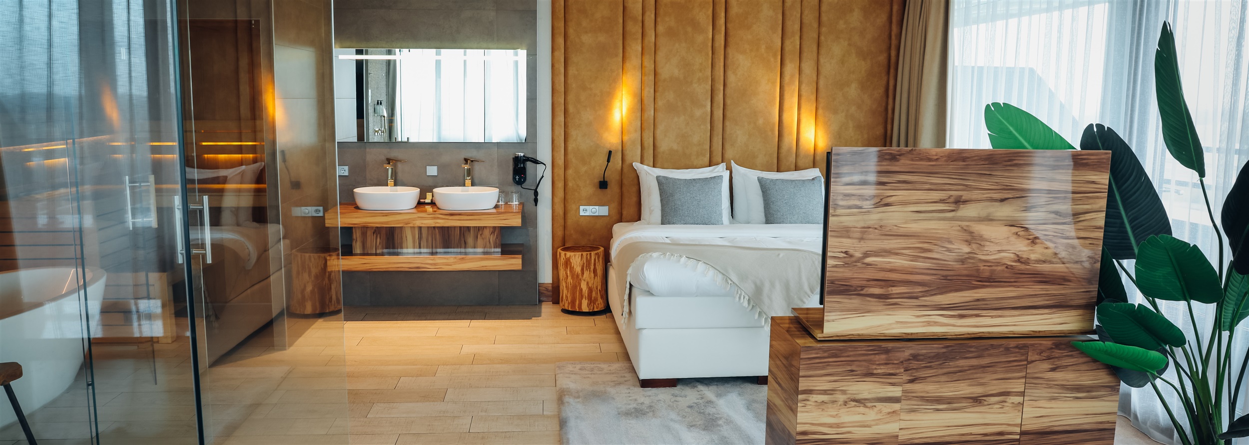 Genießen Sie in Ihrer eigenen Sauna, Dampfdusche und anschließend ein Glas Luftblasen im Sprudelbad und träumen Sie dann im großen King-Size-Bett. Willst du das? Dann buchen Sie das Suite Dream Package und wählen Sie aus der Ibiza, Dubai oder Bali Suite.